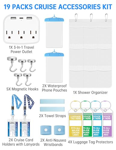 Premium Combination: You will receive 19 cruise accessories, including 1 power strip, 2 cruise card lanyards, 4 luggage tag holders, 2 waterproof phone bags, 2 towel bands, 5 magnetic hooks, 2 anti-seasickness bands, and 1 cruise shower organizer bag. This set covers all your needs for a cruise trip.