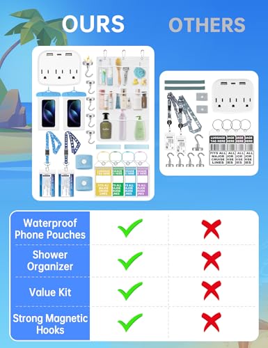 NiHome 19-Piece Cruise Journey Necessities Equipment – Energy Strip, Waterproof Cellphone Luggage, Baggage Tag Holders, Magnetic Hooks, Cruise Card Lanyards, Towel Bands, Anti-Seasickness Bands and Bathe Organizer Bag